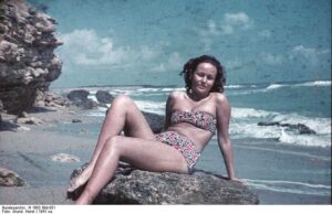 E riesce nell’impresa solo con la spogliarellista Micheline Bernardini, che abituata alla nudità esibendosi al Casino de Paris,  accetta risultando anche più vestita del solito. Il 5 luglio del ’46 al Piscine Molitor di Parigi la Bernardini mostra e inaugura il nuovo bikini. Sembra però che già nel 1939 la casa di moda Jantzen, crea un due pezzi meno ridotto, con pantaloncino e bustino, ispirato al film “La donna dai due volti” con Greta Garbo.