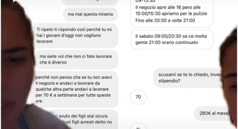 “Su Instagram – racconta la giovane – una ditta di abbigliamento ha scritto ‘cercasi persone per lavorare’… Io la contatto e mi viene chiesto di dove sei, come ti chiami, se ho esperienza. Fino a quando non arriviamo al discorso degli orari e dei soldi. Mi viene risposto che l’orario è dalle 9 alle 13,30. Il negozio riapre alla 16 ma in negozio bisogna arrivare alle 15-15,30 per pulire. Poi fino alle 20.30-21.