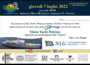 Il Tour di Voucher – Il Turismo in onda, ideato e condotto da Anna Di Maria e Paky Arcella, parte dal Golfo di Napoli in direzione Capri. Sul Motor Yacht Patrizia, fiore all’occhiello della flotta NLG, giovedì 7 luglio, alle ore 18.30, con partenza dal Molo Beverello di Napoli, ritorna il rinomato “Aperiviaggi”, curato da Mercato Italiano, progetto della Breakpoint seguito da Clara e Lucio Starace.