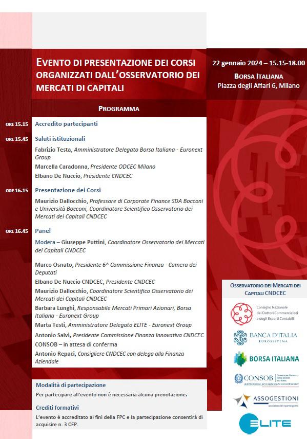 Nel corso dell’evento è prevista la presentazione dei corsi da parte del prof. Maurizio Dallocchio, Professore di Corporate Finance SDA Bocconi e Coordinatore Scientifico dell’Osservatorio dei Mercati dei Capitali CNDCEC.