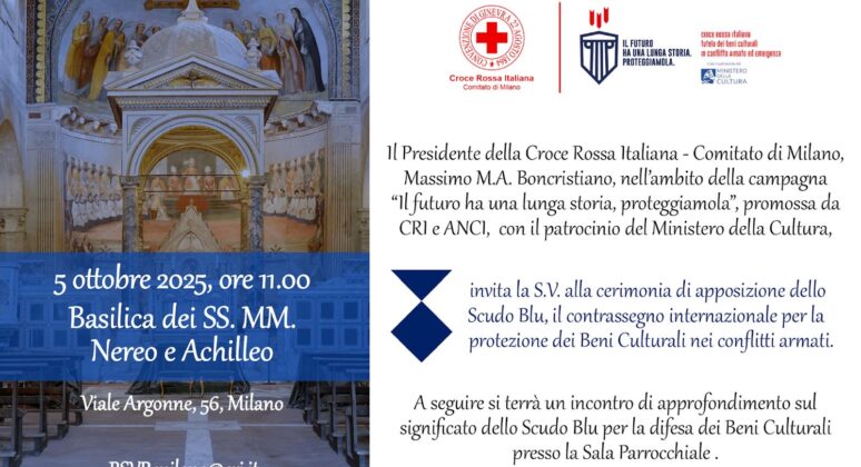 Nereo e Achilleo, “ lo Scudo Blu verrà apposto alla sinistra del portale d’ingresso e la nostra sarà la prima chiesa di Milano che potrà fregiarsi di questo riconoscimento.” Continua don Gianluigi Panzeri: “Sono riconoscente alla Croce Rossa di Milano, per aver identificato in questa chiesa, miglior esempio di stile razionalista in un edificio religioso, un alto valore culturale che merita di essere in ogni caso protetto e preservato.” “Apporre lo Scudo Blu sulla Basilica dei Santi Martiri Nereo e Achilleo significa proteggere la cultura e l’arte e, con essi, l’identità di un popolo. Inoltre, ci permette di lasciare un segnale, un’eredità importante alle generazioni future: tutelare la cultura equivale a difendere la nostra Umanità.” afferma Massimo Boncristiano, presidente della Croce Rossa Italiana, Comitato di Milano.