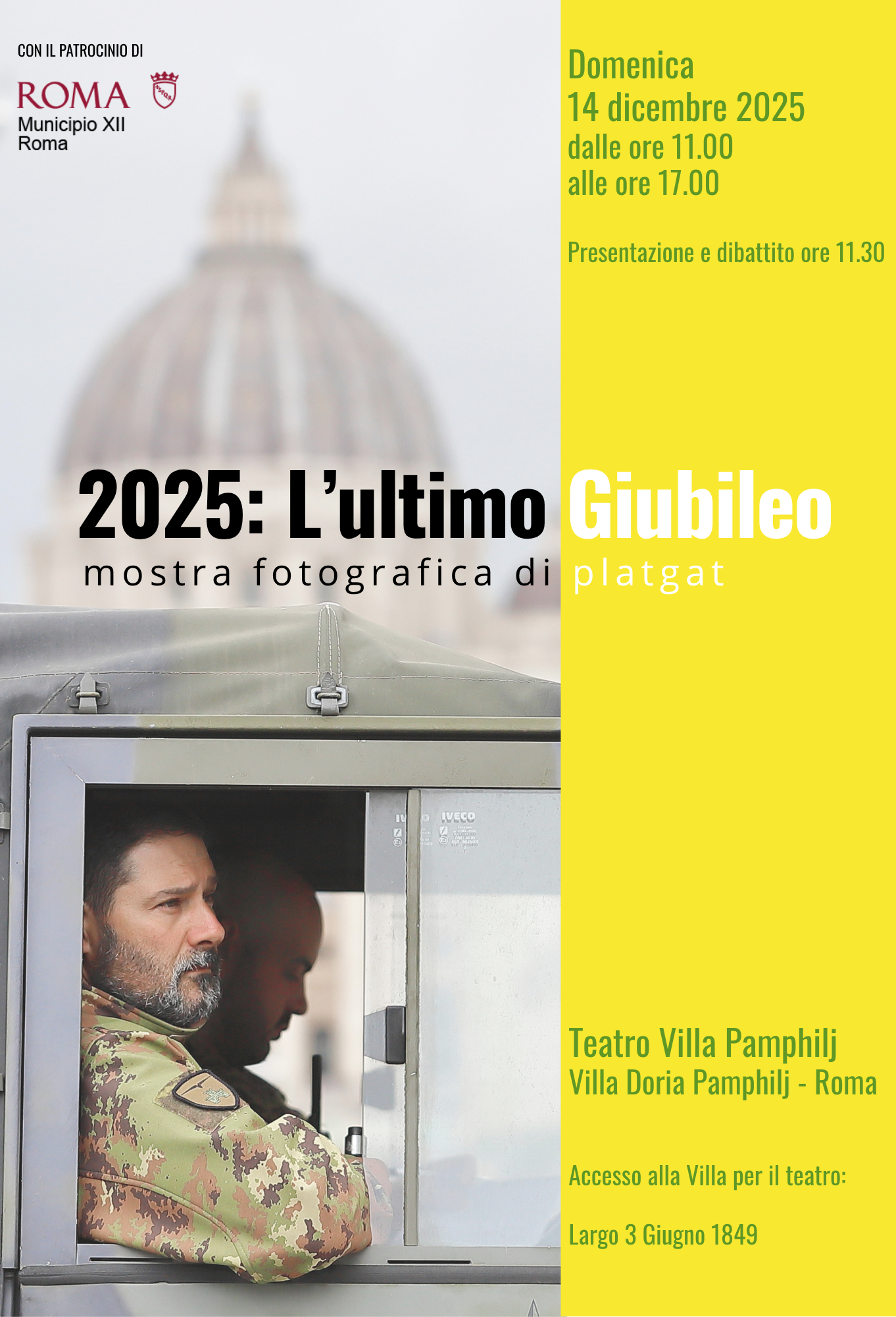Il 14 dicembre 2025, per un’unica giornata, il Teatro Villa Pamphilj accoglierà la mostra fotografica 2025: L’ultimo Giubileo, il nuovo progetto di platgat, artista romano che torna a esporre nella sua città. In questo lavoro, la forza visiva della street photography si intreccia con la profondità del reportage, raccontando una Roma attraversata da fede, turismo, contraddizioni e speranza.