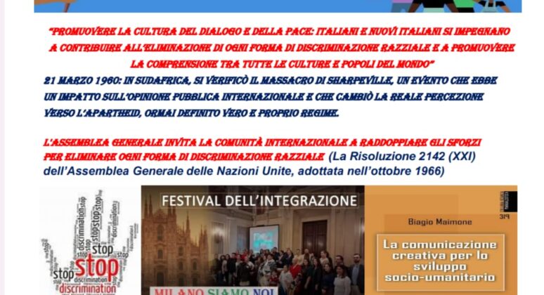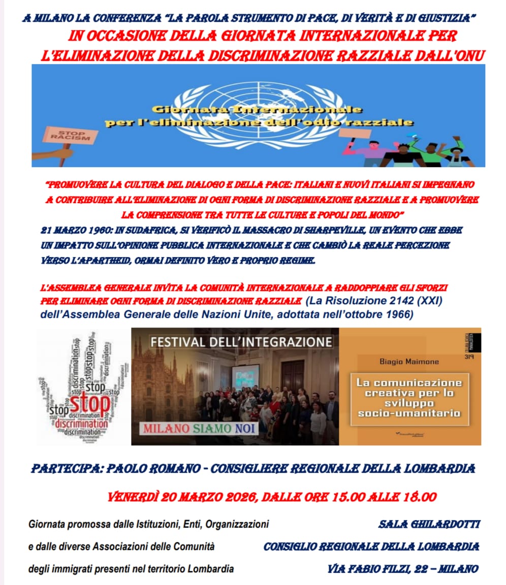 In occasione della Giornata internazionale per l’eliminazione della discriminazione razziale, venerdì 20 marzo 2026, dalle ore 15.00 alle 18.00, si terrà a Milano la conferenza dal titolo “La Parola strumento di Pace, di Verità e di Giustizia”.