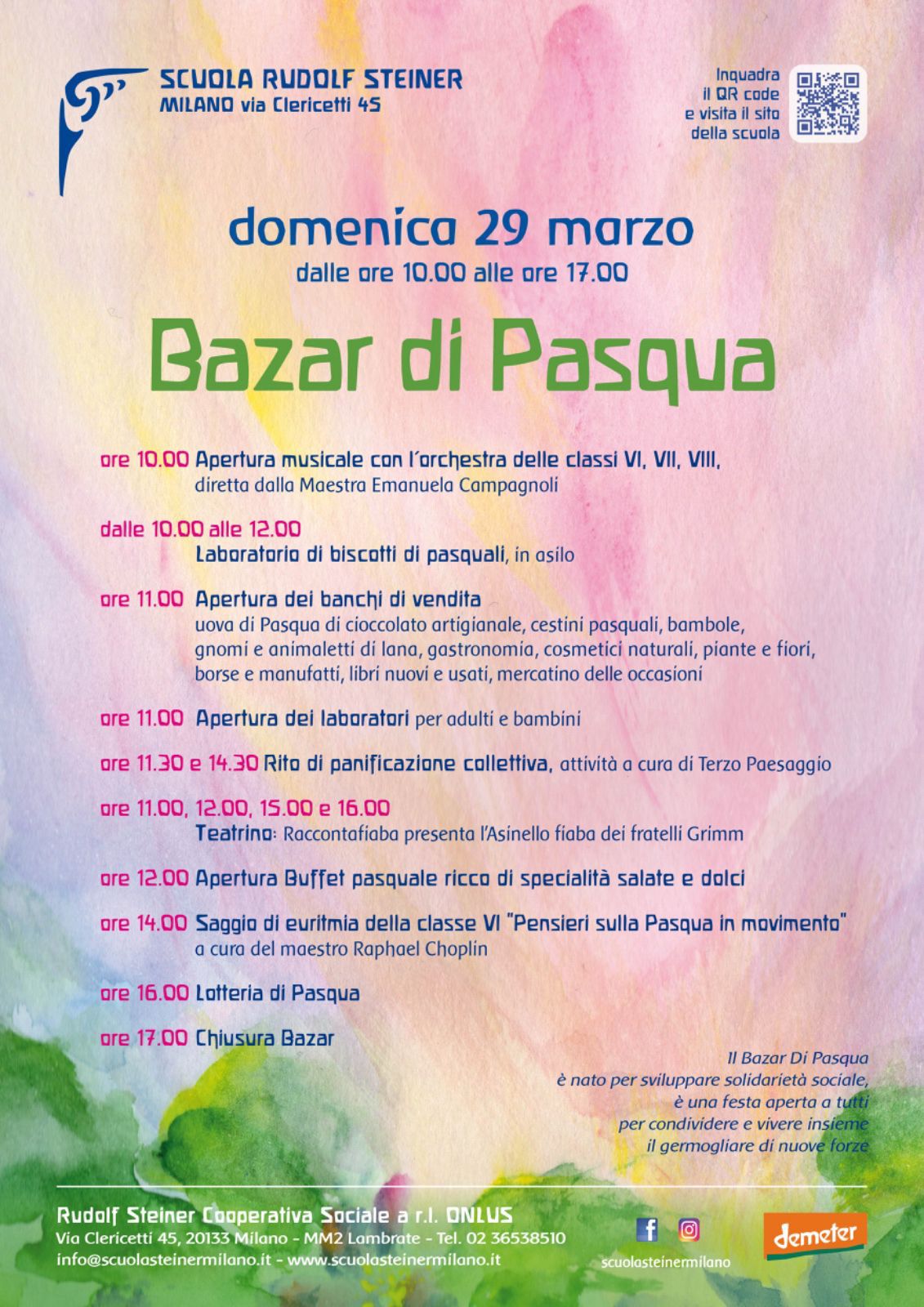 «Il Bazar di Pasqua è per noi molto più di un momento di festa: è un invito ad avvicinarsi alla bellezza della stagione pasquale attraverso gesti semplici, artigianali e ricchi di significato. Ogni oggetto, ogni attività, ogni scena di teatro o di euritmia nasce dal lavoro condiviso di bambini, ragazzi, genitori e insegnanti, e racconta lo spirito di comunità che anima la nostra scuola. Apriamo le porte con gioia – desiderosi di accogliere chi vorrà scoprire più da vicino la pedagogia Waldorf e vivere, insieme a noi, un giorno colmo di luce, creatività e incontro.» ha dichiarato Adriana Ciarchi, Referente pedagogico della Scuola Steiner.