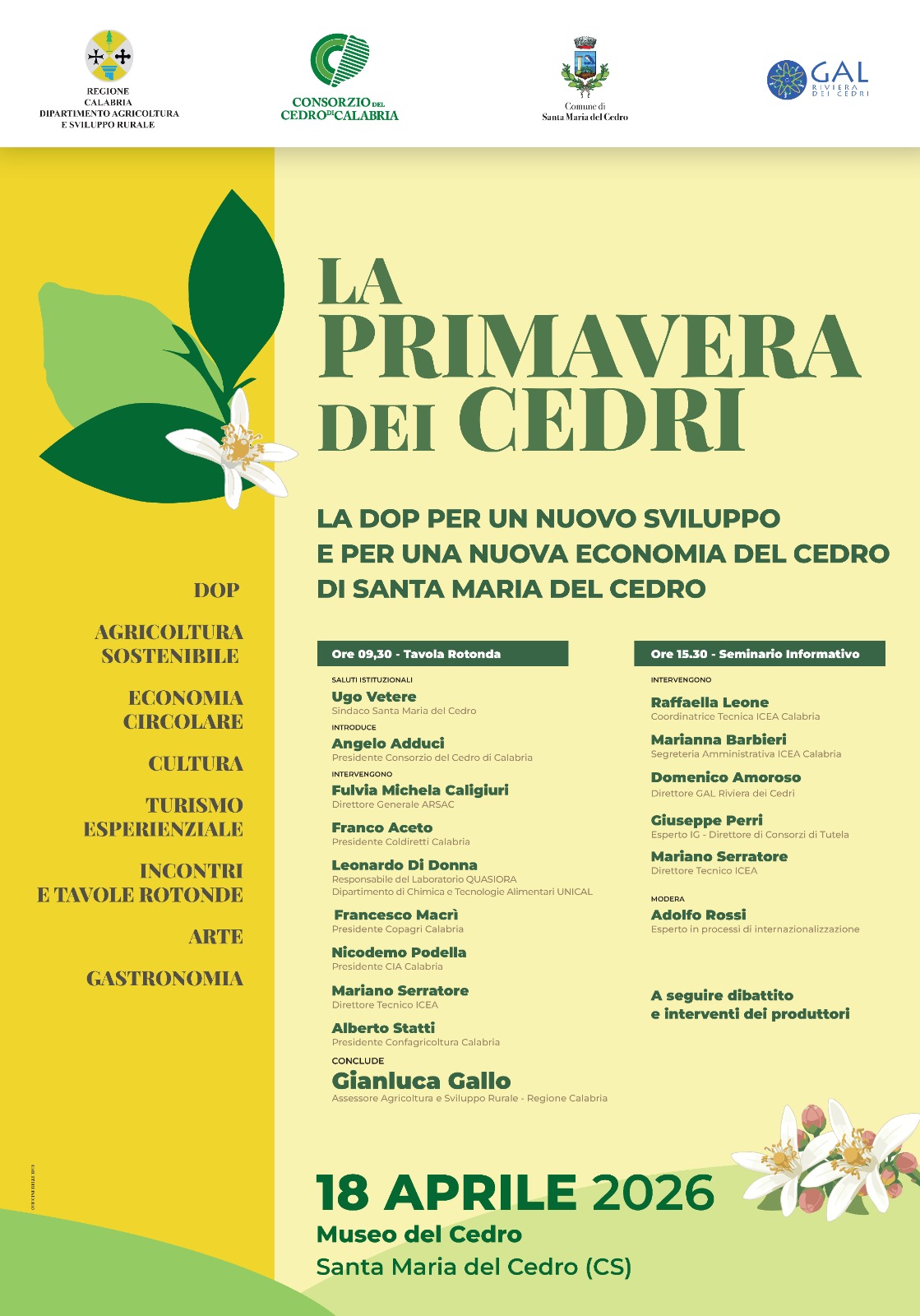 La giornata del 18 aprile si articolerà in due momenti principali. In apertura, la tavola rotonda istituzionale, con i saluti del sindaco Ugo Vetere e l’introduzione di Angelo Adduci, presidente del Consorzio del Cedro di Calabria.